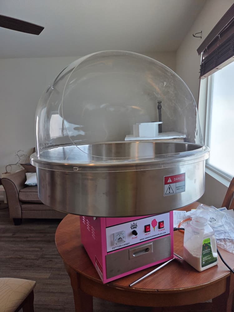 - Spinning head with metal construction releases cotton candy vertically to prevent clogging